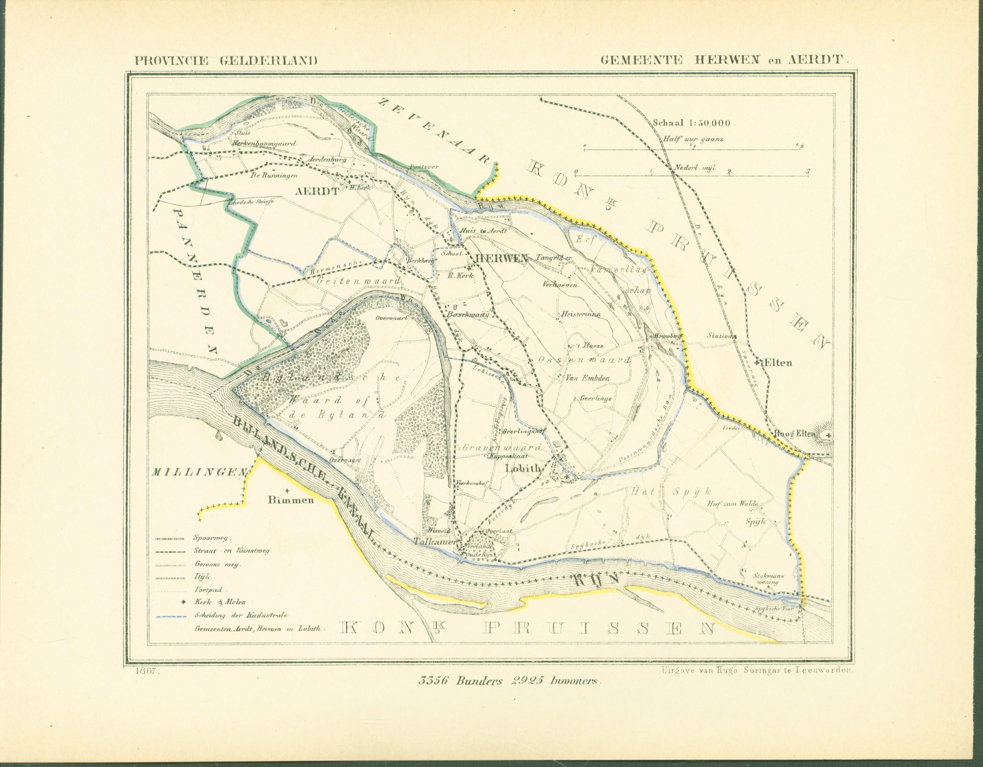 Inhoudelijke beschrijving: Map Kuyper Gemeente atlas van GELDERLAND This is an original map taken from an incomplete copy of the Gemeente Atlas van GELDERLAND by Jacob Kuyper ( 1821 – 1908). Issued in 1867 by Surringa Leeuwarden. All maps were printed in black. The outline border of the Municipality were coloured by hand. De Gemeente Atlas van Nederland verscheen ca. 1868 en werd uitgegeven door Hugo Suringar te Leeuwarden. Voor iedere provincie een deel. Het bevat de kaarten van alle Nederlandse gemeenten. De kaarten werden in zwart/wit gedrukt waarbij de gemeentegrenzen met de hand waren ingekleurd. De tekenaar van de kaarten, Jacob Kuyper (1821-1908) was een belangrijke pionier op het gebied van de thematische cartografie en medeoprichter van het Koninklijk Nederlands Aardrijkskundig Genootschap (KNAG). Hij stelde in de periode 1857-1880 verschillende atlassen samen. De bekendste atlas was de Gemeente-Atlas van Nederland. De kaarten voor deze atlas tekende Kuyper in de jaren 1865-1870