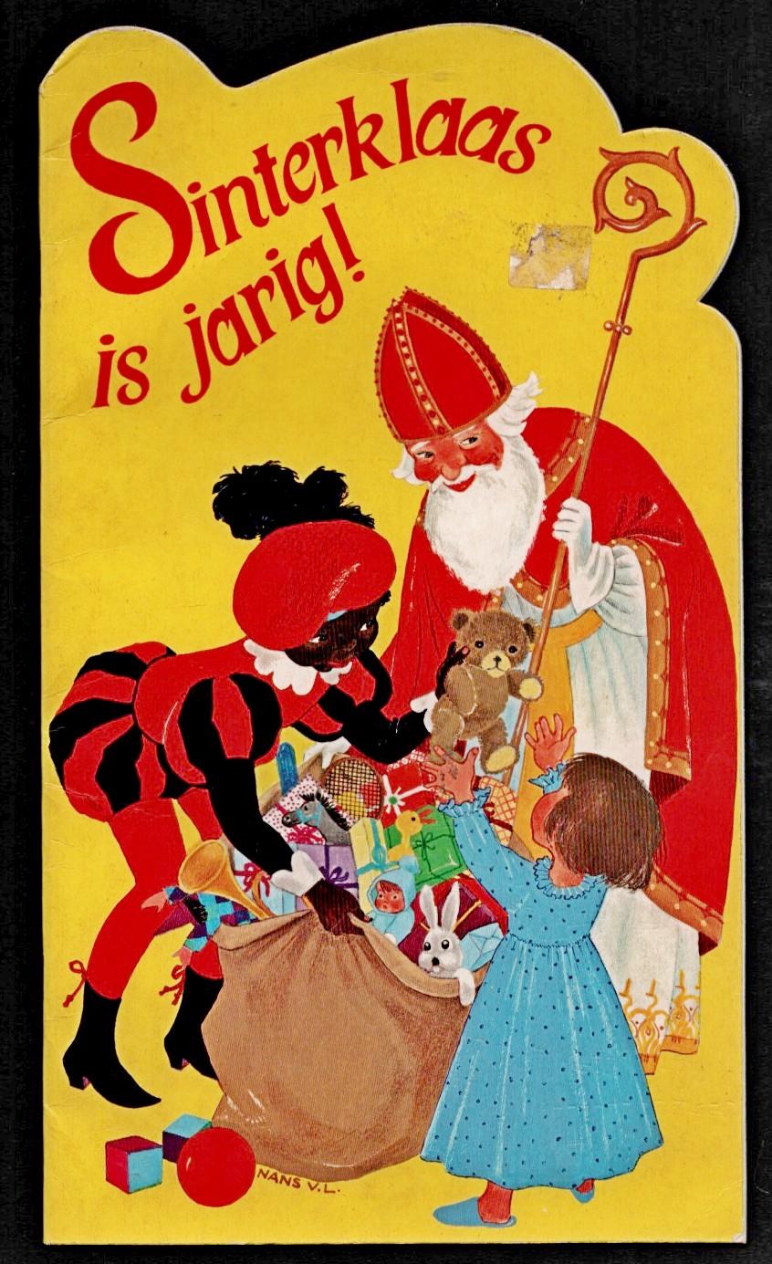 gekleurde illustraties, Illustraties gesigneerd Nans v.L. of N.v.L. (is Nans van Leeuwen), Omslagtitel: Sinterklaas is jarig!, Op achterkant: Hema, K 14, 1.50, 1491 1011, Datering: niet in Brinkman, jaartal geschat; 32 ongenummerde pagina's, 34 cm Binnenzijde achterplat met kinderkrabbels.