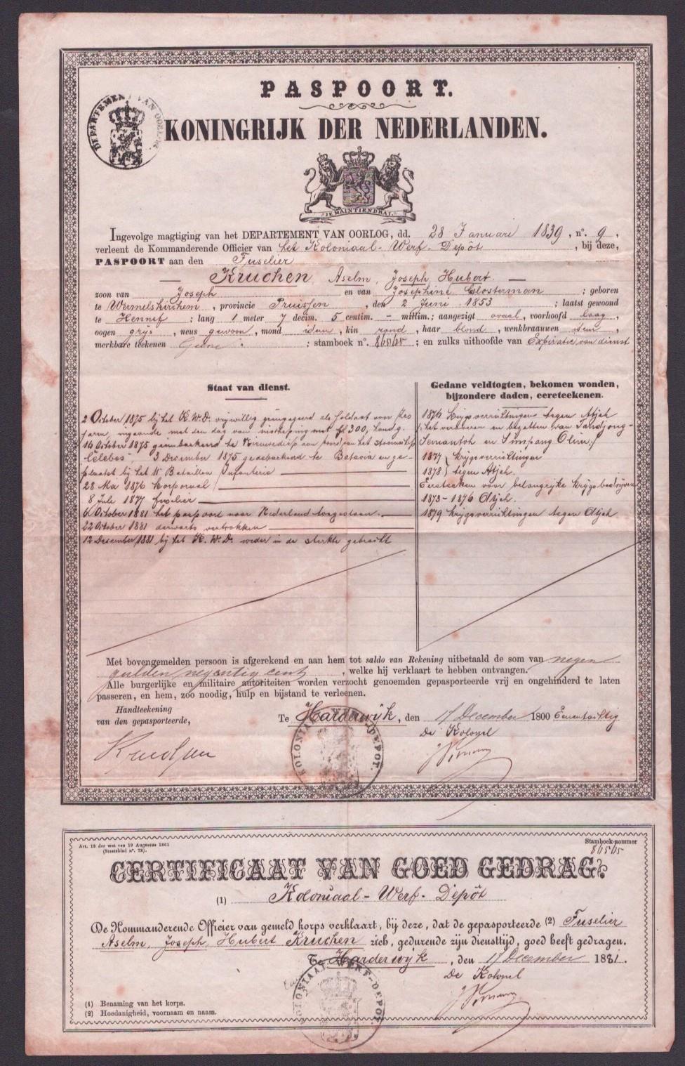 Origineel paspoort met certificaat van goed gedrag voor: Fusselier - Aselm Joseph Hubert Kruchen Zeldzaam document waarop ook zijn "loopbaan" in het leger staat geschreven.
