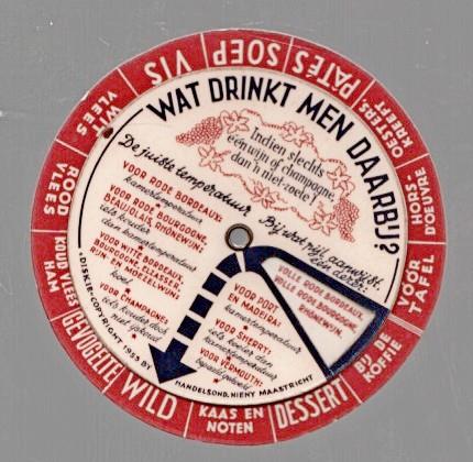 Ronde draaischijf met daarop een draaibake schijf met uitsparing. Bedoeld om de DRANK te bepalen bij verschillende gerechten. Diameter 9,5 Cm ZELDZAAM